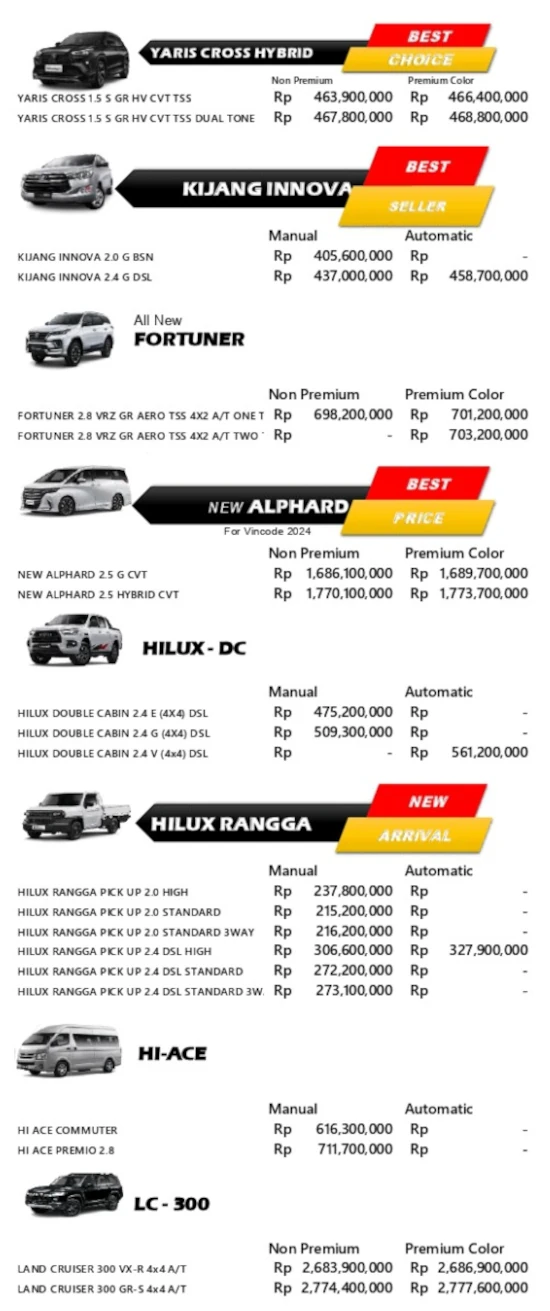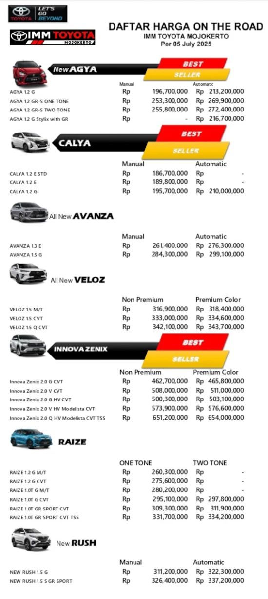 Harga Mobil Toyota Berikut ini daftar harga terbaru mobil Toyota 2025 di Mojokerto PERSYARATAN KREDIT : FOTOKOPI KTP SUAMI ISTRI FOTOKOPI KARTU KELUARGA FOTOKOPI NPWP FOTOKOPI BUKU TABUNGAN 3 BULAN TERAKHIR FOTOKOPI PBB FOTOKOPI SLIP GAJI / SIUP / SKU